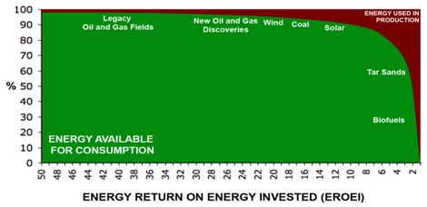 You might bring in concerns about global warming into this discussion, but in my opinion, that is icing on the cake. It is a straight-forward economic calculation that will dictate our migration away from fossil fuels. By the way, one final thought on the EROI charts – if you are using a fossil fuel to convert it into electricity, you run into thermodynamic losses. Even in an extremely modern power plant, 40% of the fuel goes into waste heat, which greatly reduces the EROI of the fuel source. So wind and solar, even though they show up as lower on the chart than fracking, they have the advantage of having converted input energy directly to electricity, thus avoiding the thermodynamic losses.