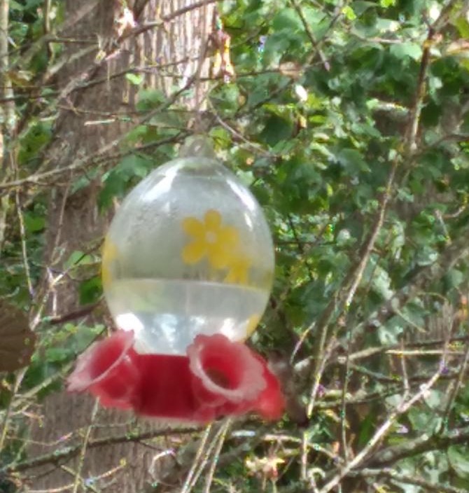 We once put a feeder out in the back off of our deck, figuring a single hummer couldn’t observe both sides of the house at once, and thus we could support more hummers. What we hadn’t figured out was that raccoons could reach the backyard feeders, and we awoke to empty hummingbird feeders after a single night. We knew no birds could do that, and we did make an inference on the raccoon, but the image of a raccoon on a sugar high, bouncing off of the trees below was too good to forget.