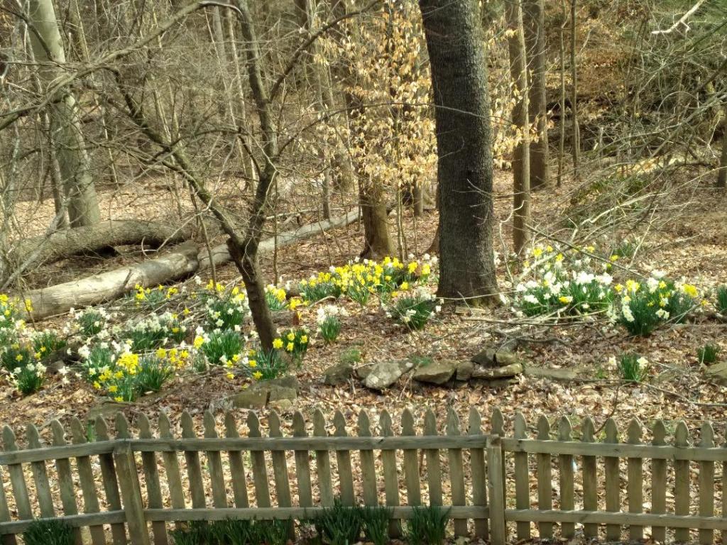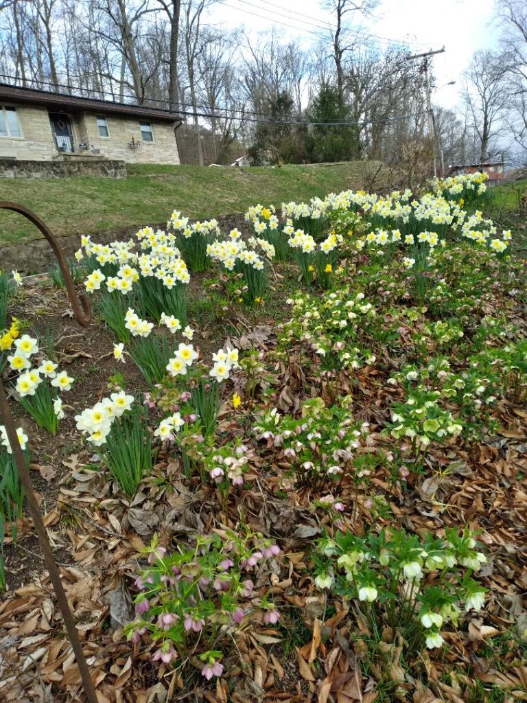 The daffodils began blooming on February 20. This was extremely early for Spring to appear in South Charleston, West Virginia. And it was not the little daffodils breaking forth first, but the hordes down the hillside where I have spread bulbs in the 30 years we’ve lived in this house. I am enclosing three pictures in this post, two showing the hillside in front, and one showing the blooming bulbs in back of the house. Not shown are the blooms around the gardens, the blooms in between our neighbor’s house and ours, or any of the blooms we have encouraged at the interface between mowed lawn and natural woodland on the side of our property. Indeed, at times like this when all of the bulbs burst forth simultaneously, you can see the thousands of blooms we have in our yard, and I have the pleasure of knowing I’ve placed a majority of these bulbs myself. I grin when I see the bees grabbing the pollen from these early flowers.